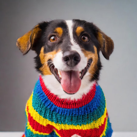 Portrait of a happy dog in a colorful sweater on a gray background