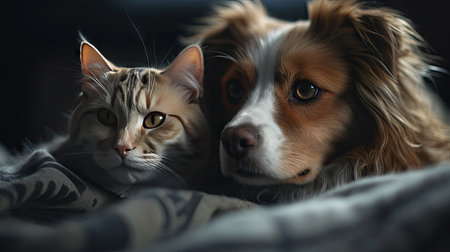 A serene image of a cat and dog resting side by side, illustrating the peaceful coexistence and unique companionship between these furry friends.