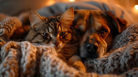 Cute cat and dog sleeping together under warm plaid at home