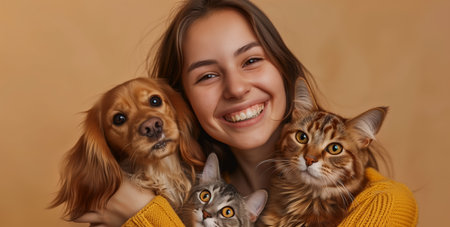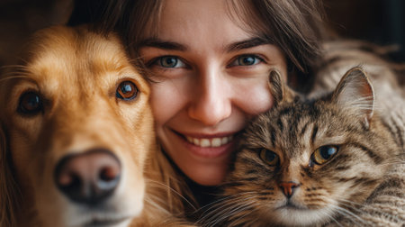 Young caucasian female with dog and cat smiling together in cozy setting.
