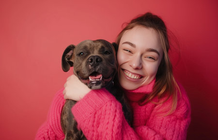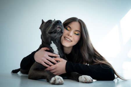 young beautiful female play with staffordshire terrier dog at hoe