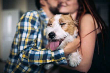 Jack Russell Terrier on the background of a couple in love. selective focus. Love story concept.