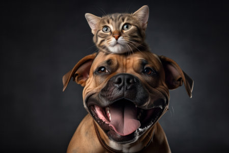 Pawsitively adorable a cat perched on a dogs head in a display of unlikely companionship and trust. AI Generative