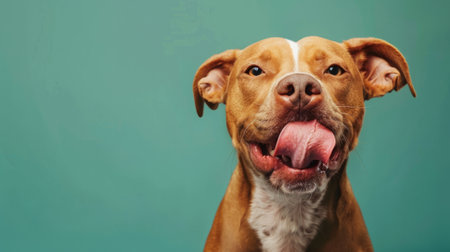 Mix breed brindle and white rescue dog licking on a teal aqua background in a studio headshot.