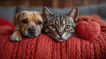 cute cat and dog are lying on a bed together surrounded by knitted red hearts.