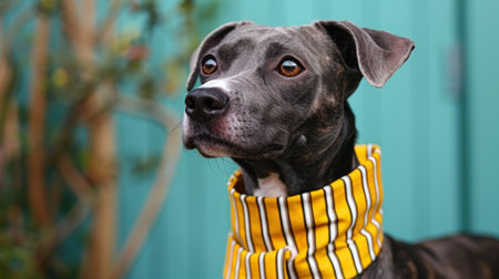 A gray dog with a yellow striped scarf looks to the side.