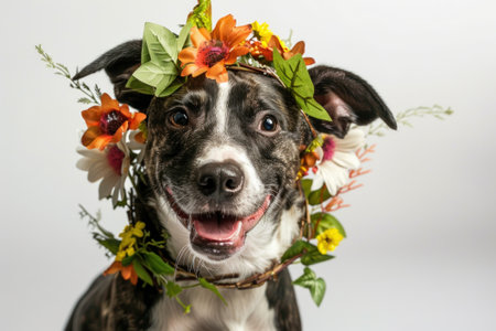 A cheerful dog with a bright smile poses with colorful flowers, creating a warm and inviting atmosphere perfect for showcasing love and joy.