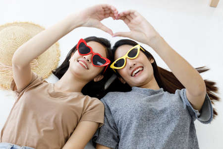 Portrait of two young asian woman in summer concept smiling and lying on white floor.