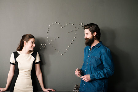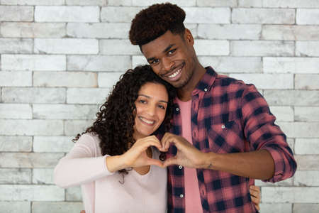 Half-length portrait of young lovely couple standing together holding hands making a form of little heart. Isolated on dark background