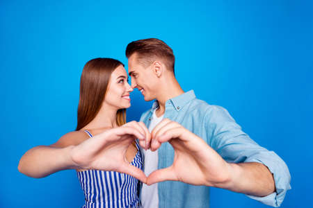 Close-up portrait of her she his he two nice attractive charming cheerful cheery tender people showing giving heart shape cuddling isolated over bright vivid shine vibrant blue color background