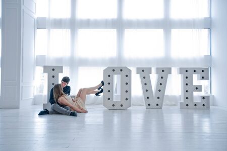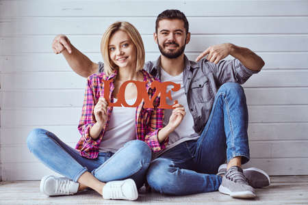 Young happy loving couple sitting on floor and holding sign Love, smiling at camera
