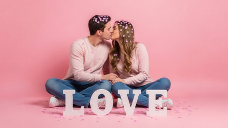 A romantic moment captured as a young couple shares a kiss, seated cross-legged with large LOVE letters in front of them, amidst a shower of confetti.