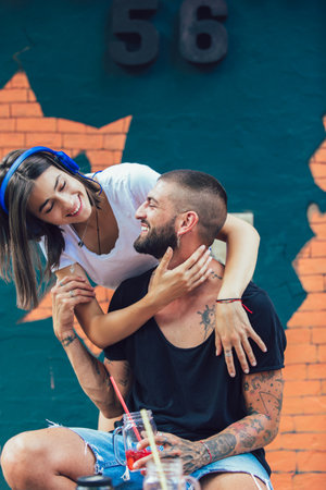 Naughty cheerful young woman with a toothy smile. The female with long blue pigtails laughs happily. A young male stands beside her. Love, relationships. Selective focus.