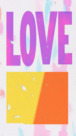 Bold LOVE text in vivid purple stands out against a textured background with splashes of pastel and a striking yelloworange block