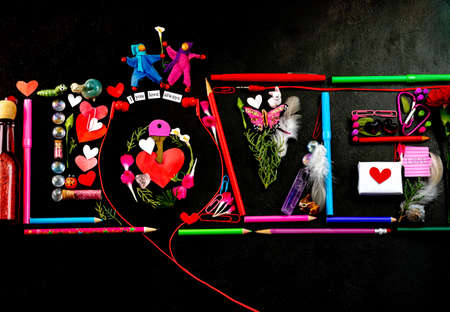 Valentines Day flat design on black background, the word LOVE spelled with art and office supplies with cut out folded hearts, gender neutral characters, butterfly and carnation petals
