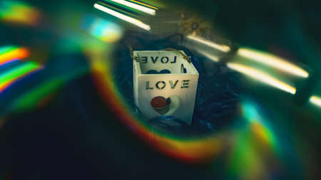 Wooden cubes with the words LOVE on heart shape candy background. Valentine's day concept