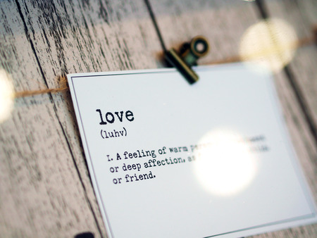 A horizontal closeup shot of a white paper with a LOVE print on a white background