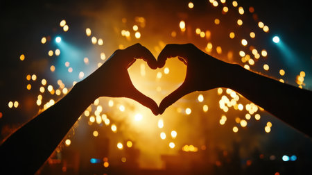 Two hands create a heart shape in front of a dazzling sparkling background, symbolizing love and connection in a vibrant, celebratory atmosphere.