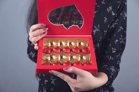 A woman holding a heart shaped box of chocolates on marble, AI