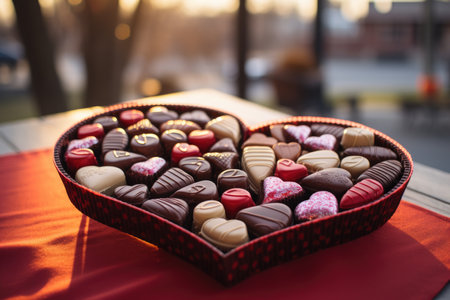 Heart-shaped box of chocolates on a red tablecloth