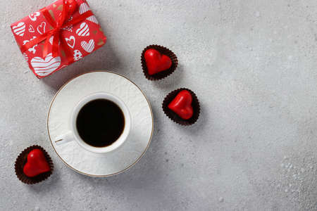 Cup of coffee, candy in the shape of hearts and a gift box with ribbon on a gray background. Valentine's day concept. View from above. With place for text.