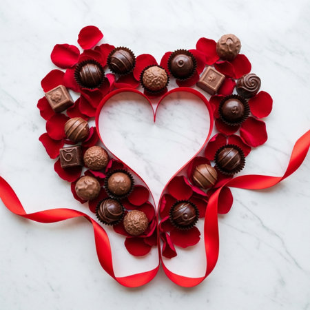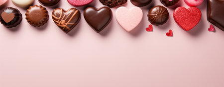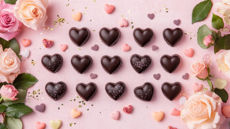 A beautiful arrangement of heart-shaped chocolates on a soft pink background, surrounded by delicate flowers and petals, creating a romantic atmosphere perfect for celebrations.