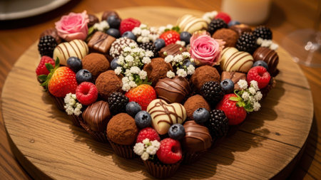 Heart-shaped chocolate candies with berries on a wooden table.