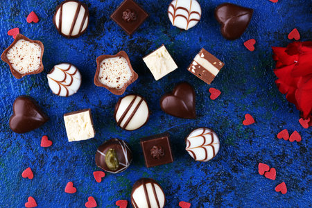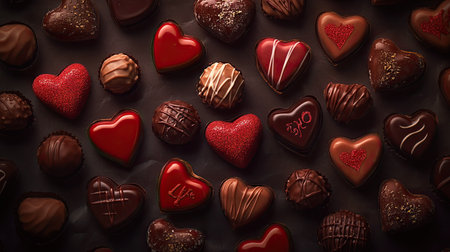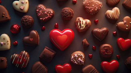 A top-down view of a Valentine chocolate set, featuring a mix of heart-shaped chocolates, truffles, and chocolate bars with love-themed designs, surrounded by soft lighting