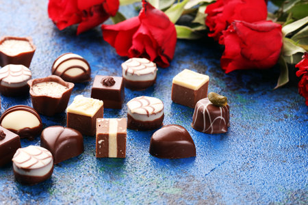 Different kinds of chocolates on colored table close-up. Top View and Flat Lay with copy space.