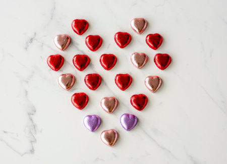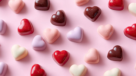 A vibrant arrangement of heart-shaped chocolates on a soft pink surface. Ideal for celebrating love, special occasions, or gifting delightful treats.