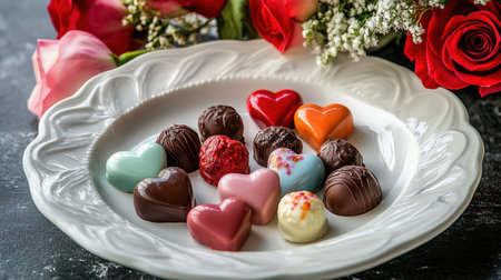 A festive Valentine chocolate set with colorful chocolate hearts, truffles, and pralines, arranged on a white porcelain plate with a bouquet of roses.