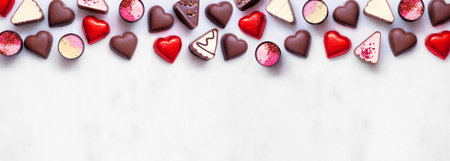 Valentines Day chocolate top border. Red and pink heart theme. Overhead view on a white marble banner background with copy space.