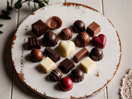 AI Generated. Assorted chocolates arranged in a heart shape on rustic wooden surface for special occasions or celebrations