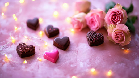 A beautiful arrangement of heart-shaped chocolates beside delicate pink roses, illuminated by soft fairy lights, creating a romantic atmosphere perfect for celebrations.