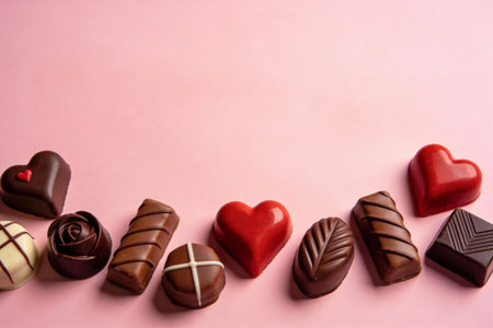 A variety of beautifully crafted chocolates, including heart shapes and floral designs, are presented on a pastel pink surface