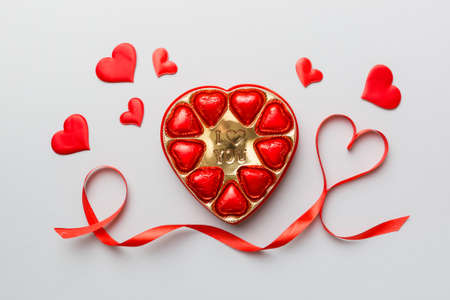 Delicious chocolate pralines in red box for Valentine's Day. Heart shaped box of chocolates top view with copy space.