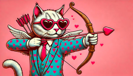 Cupid cat with sunglasses and suit with hearts holding bow and arrow on valentine day. The cat is dressed up for Valentine's Day.