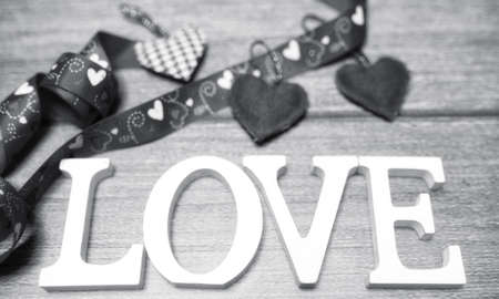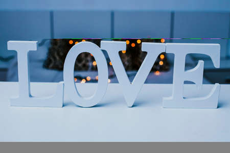 the word love made up of wooden white letters on the table