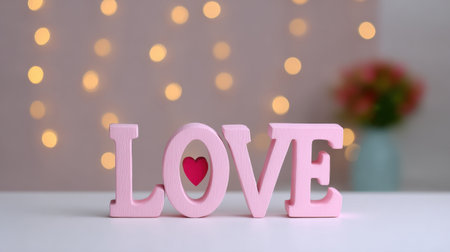Captivating image of wooden pink letters spelling 'LOVE' adorned with a heart, set against a soft, blurred background offering a warm and romantic ambiance.