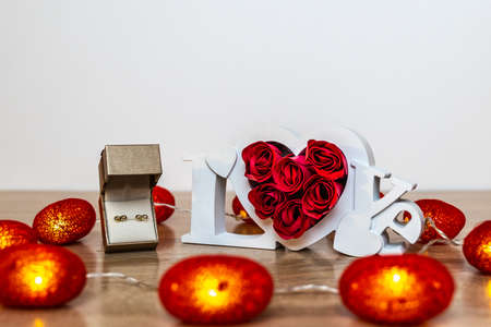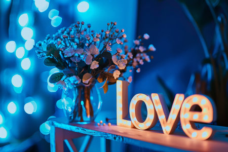 Romantic love decor with flowers and lights