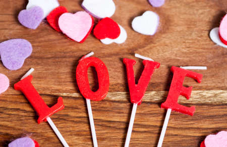 word Love from wooden letters with colorful fabric hearts on a wood background. Happy valentines day