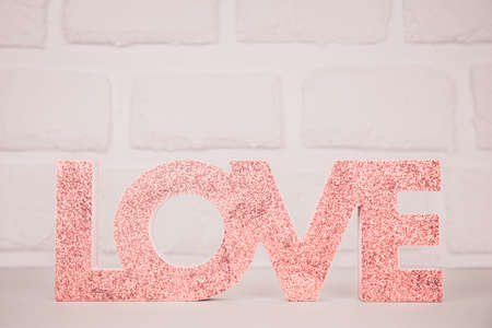 Banner. The word love is laid out in wooden letters with a red heart on a gold background. The concept of a Valentines day greeting, for a wedding.