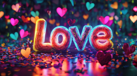 A colorful image of hearts and the word LOVE written in neon letters. Concept of love and happiness, with the bright colors and the abundance of hearts