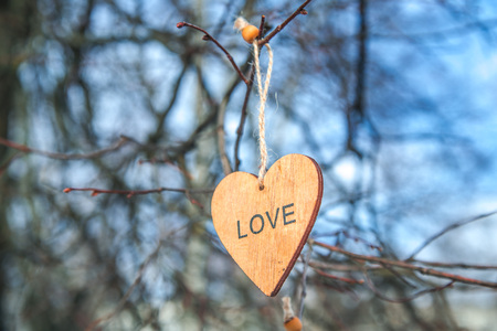 Word Love in the form of a heart on a tree branch with bokeh background