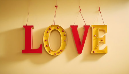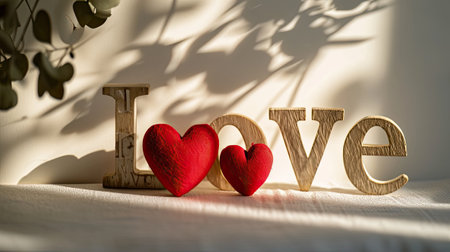 inscription Love alongside two vibrant red hearts on a light background, emphasizes clean lines and contemporary aesthetics to convey the simplicity and beauty of love