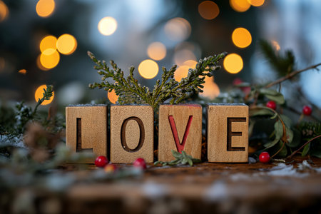 Love lettering on the Christmas tree with bokeh background.
