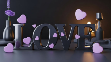 A beautifully arranged still life featuring a LOVE sign surrounded by purple hearts, a vase with lavender, and soft candlelight, evoking a sense of warmth and affection.