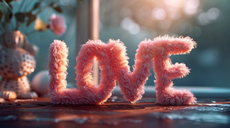 Fluffy lettering LOVE pastel light color palette. Light sunny background. Romantic concept. Generative AI.
