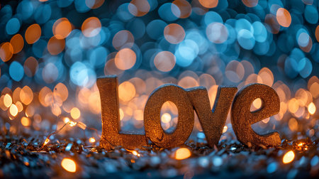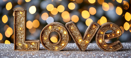 Romantic postcard on enchanting bokeh sparkles background with golden love text