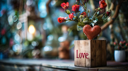 A close-up shot of wooden letters spelling LOVE, placed next to a charming blue vase filled with delicate pink roses, creating a warm and romantic atmosphere.